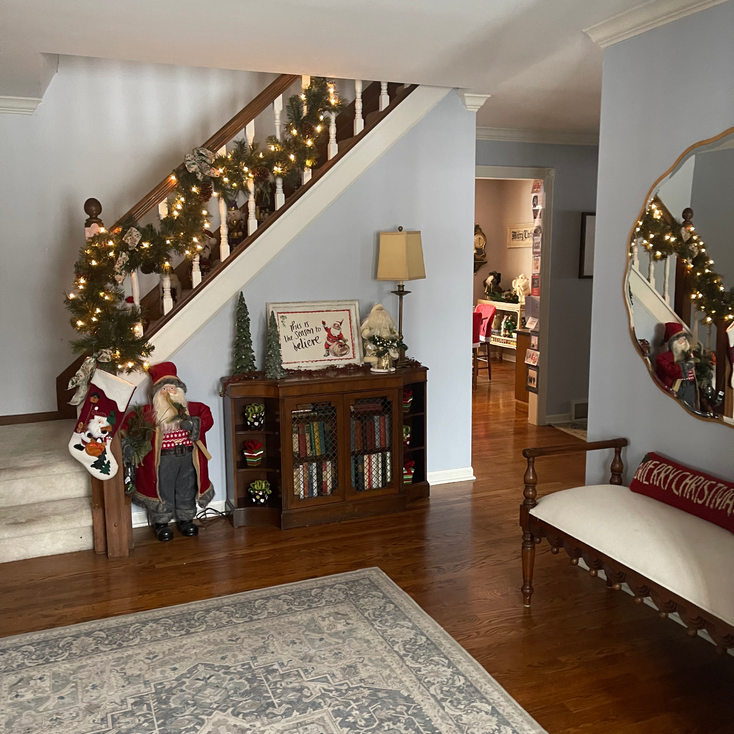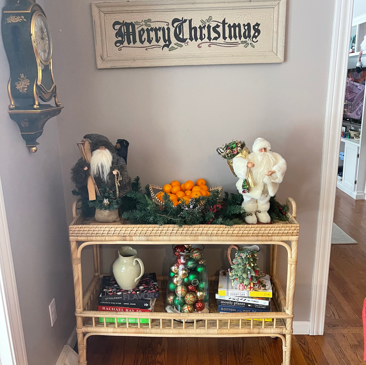 More from our home – our Serena & Lily sidecart in our kitchen holds vintage Santas and a Spode pitcher, while our foyer includes additional vintage santas along with a retro piece of art.